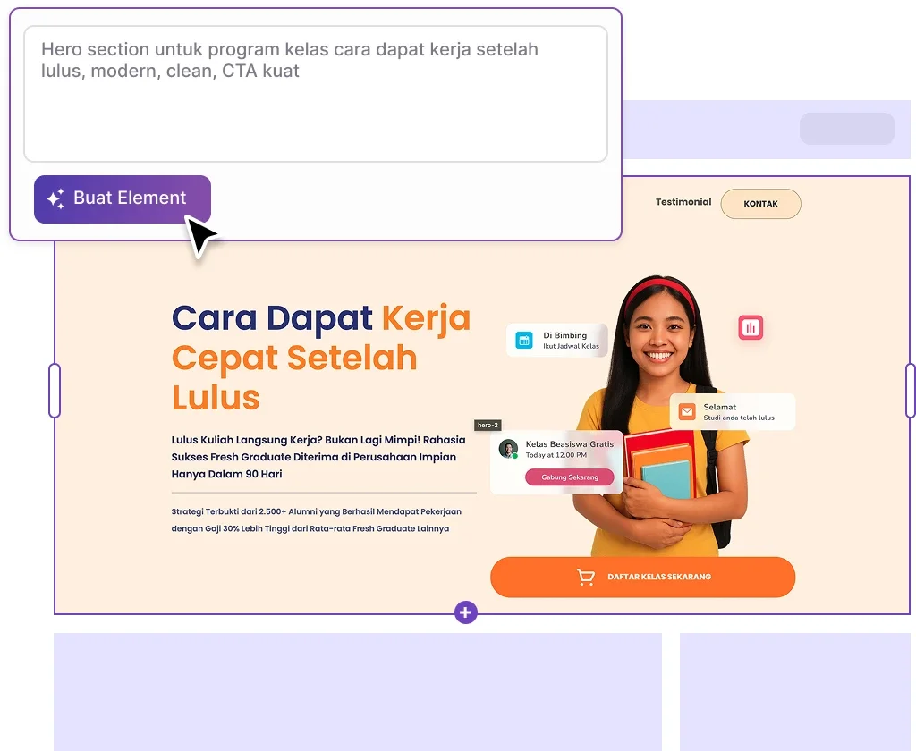 Fitur AI kami membantu menyusun landing page dengan alur copywriting yang rapi + wireframe yang logis,