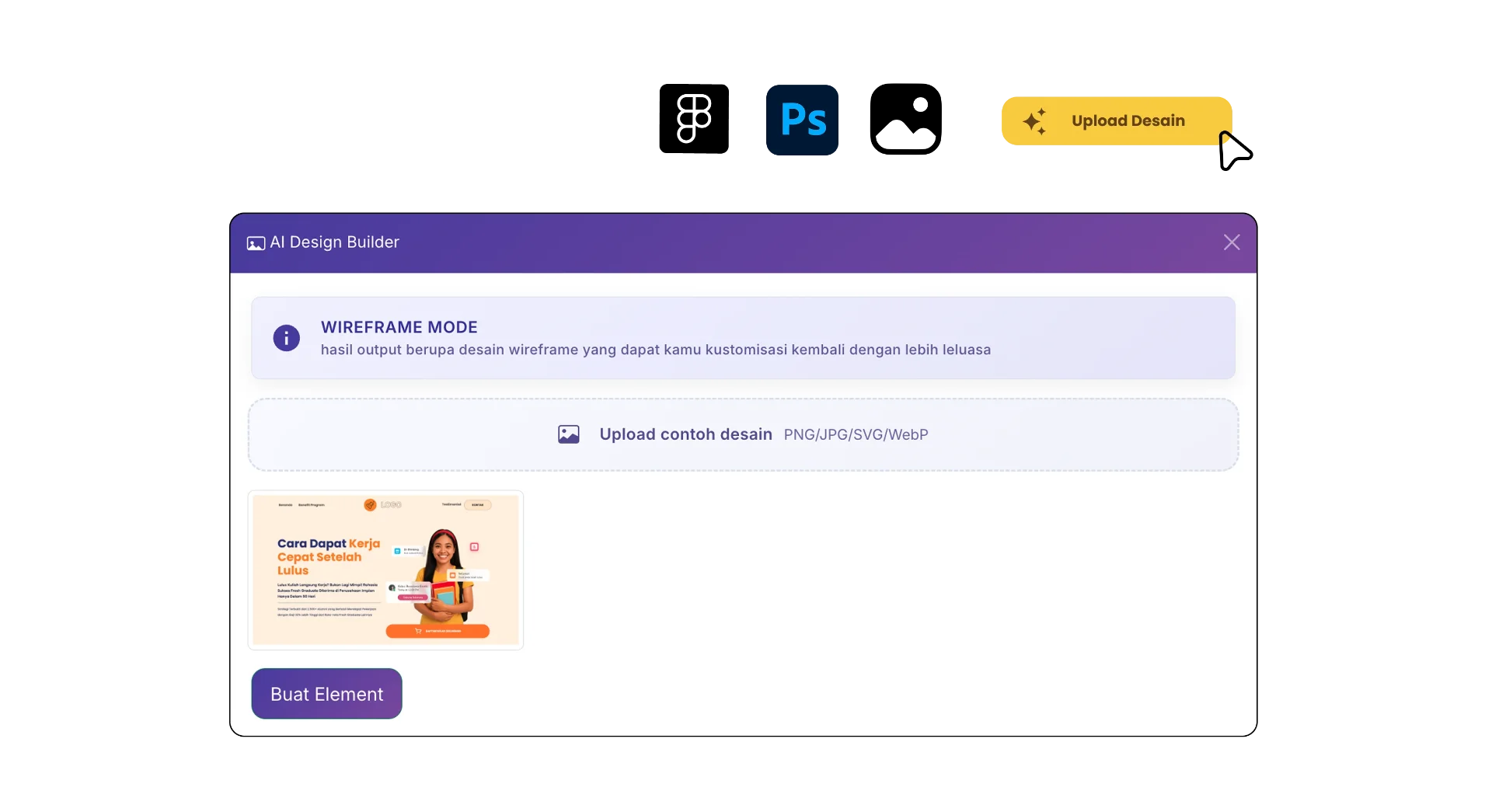 Upload desain → AI analisis → langsung jadi wireframe siap edit.